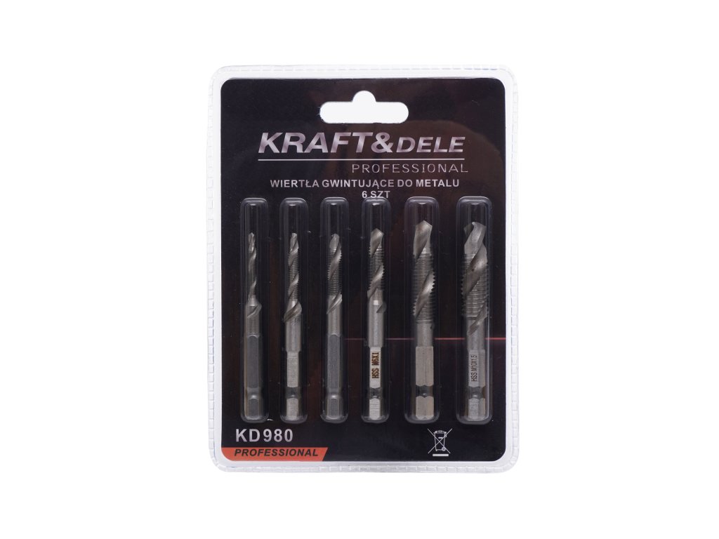 Sada 6 vrtáků z rychlořezné oceli (HSS) značky KRAFT&DELE vyrobená metodou broušení. Doporučená práce kombinovaných vrtáků na nízkých otáčkách, vhodné použití chladicí kapaliny během práce.